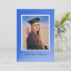 A unique card with a modern blue, gradient color scheme. Similar blue background on the back of the card containing details. Suitable for a high school or college graduation. The photo and all text are easily changed with the template. Selecting “Personalize this design” offers you several edit options to easily change the text (wording, plus type font, color, size, position) and to edit the design elements. You may also want to scroll down to the section “Transfer design to a product” for a few suggestions about other items this design can be used on.