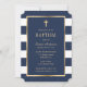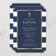 Elegantens blåraka baptisminbjudan som visar guld kor, ram och små stjärnor.
