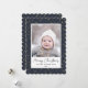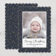 Skicka semesterhälsningar med anpassade och personlig till vänner, kolleger och familj i enkla, minimalistiska, elegant, roligt, festliga och moderna fotokort! Ett vackert ram med olika vinterstjärnor från guld på blå himmel vid marinens baksida omger ditt foto på kant papper runt scallop. Hälsning " God jul " skrivs i elegantens kalligrafi, och i det följande visas anpassningsbarnas meddelande hälsning från din familj namn i modern typografi. Vänd för att visa en vacker vinterstjärna i guld på blå himmel mönster vid flottan.