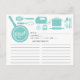Contemporary Möhippa Köksrecept-kort med ett snyggt handskrivet typsnitt med en fritorpanna, visare, spatel, handmixer, pottong, rullande stift och redskap. Framsidan av vårt recept-kort ger utrymme för en recepttitel, servar, förberedande tid och total tid och utrymme för ingredienser. Vänd riktningarna för recept-kortsvyn. Besök vår butik för att matcha inbjudningskort för möhippa Tillgänglig i vår butik i ett stort urval av populär möhippa färg. Perfekt inbjudningskort för möhippan sätter in köket i möhippan för lagrar.
