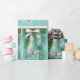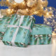 Vackra retro papper med blått, turkos klockor, försedd med ett vitt band av söt hängande från Julgran grenar.