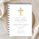 Anpassningsbar Modern Blue Kor Boy First Communion-inbjudan. En del av Dusty Blue Script Kor Boy First Communion Suite med matchande kontorsutrustning och första party-tillbehör.