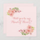 Elegant blush rosa blomsterkort med texten "vill du vara min brudtärna" har buketter av pastellika akvarellrosor, hibiskus och andra små blommor i nyanser av blush rosa och persika, med yppiga gröna botaniska blad. Det är placerat mot en blek rosa bakgrund.