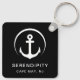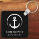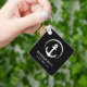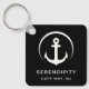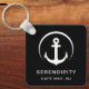 En modern nautisk nyckelkedja för din båt som innehåller en vit illustration av ett ankare i en cirkel på en svart bakgrund. Anpassa med båtens namn och plats i vit typografi.