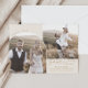 Den här moderna boho arch-krämen 2-fotot sparar datumkortet som perfekt för ett enkelt bröllop. Bohemikrämen och guld har en unik industriell präglingstypografi med minimalistisk vintage stil. Anpassa kortets framsida med 2 foton, namn, datum och bröllop.
