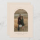 Ett enkelt och elegant beige bröllop foto spara datum-kort, designat med en båge i mitten och script-skrift på baksidan. Anpassa med dina kommande bröllopsdetaljer på fram- och baksidan av kortet.