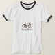 Ride i stil med den här unika T-shirt. Den visar minimalistisk cykelbanekonst som ställs mot en öppen bakgrund, som lyfts fram av "Lycklig Rides" i ett contemporary sans-serif-typsnitt och en harmonisk boho färg-palett, perfekt för den moderna fria andan.