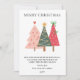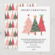 Send a cheerful, whimsical holiday greeting with this playful Christmas card design. It features three charmingly illustrated Christmas trees in a vibrant palette of pink, forest green, and berry red, topped with fun accents like bows, stars, and hearts. The simple, elegant text delivers a heartfelt message of peace, laughter, and family warmth. This modern and artistic card is perfect for creative families looking for a unique, colorful, and joyful piece of holiday stationery.