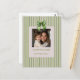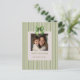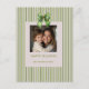 Ett festligt julkort som du kan anpassa med ditt eget foto. Designen inkluderar eleganta vertikala gröna ränder på en vit bakgrund, en dekorativ grön rosett i toppen och hälsningen "God Jul" i grön text, följt av namnet på din familj i mindre typsnitt. Layouten är enkel men elegant, perfekt för att skicka säsongsbetonade hälsningar.