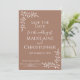 Romantisk enkel men elegant boho-design av löv- och bärlinekonst som sätts på, färg på året, mocha mousse. En mysigt brun skugga av sofistikering och raffinerad jordskönhet. Perfekt för en varm atmosfär i elegant bröllop som parar gott med gröntar och nyp. Klassisk elegans på framsidan med en lätt blandning av vitt skript och starkt fet vitt teckensnitt. På baksidan fortsätter löv- och bärdesignen där du kan lägga till ditt favoritfotografi och där du kan behålla den text som finns där, eller så kan du lägga till ditt eget och naturligtvis bröllop-datumet. En perfekt som påminner om det magiska datumet för kom. Om du behöver hjälp med att skapar det här objektet på egen hand kan du skicka ett e-postmeddelande till mig på designsbykatz@gmail.com. Jag skulle vara lycklig för att hjälpa till. Grattisar på din stora dag.