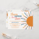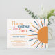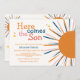 "Här kommer barnduschinbjudan till barnet", ett färgstarkt solstråle med färgad marin blå, orange, rosa typografi " Här kommer sonen". Perfekt för pojke, solskenstema för babydusch. Du kan anpassa text och färg.