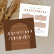 Modern business appointment reminder cards with bohemian arch background and terracotta color scheme - you can edit all colors to suit your brand aesthetic. The modern serif font reads 'Appointment Reminder', with space for your business details and logo. There are 4 date and time slots included, edit using the design tool to add / remove the slots as needed. This minimal boho booking reminder card can suit your lash salon, nails spa, hair stylist or makeup studio, boutique and more!