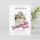 Announce your upcoming bachelorette bash with this elegant photo invitation! This design features a vibrant purple script announcing 'Bachelorette Party!' overlaying a cherished photograph of the guest of honor. The accompanying text details all the essential information for the celebration, ensuring your guests have everything they need. It's a sophisticated and chic way to invite your favorite ladies to a night of fun and celebration. Perfect for a modern bride who loves a pop of color and personalized flair.