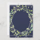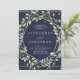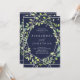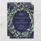 Den här inbjudan från elegant bröllop har ett modernt, silver-utseendet geometriskt ram med en utandning fylld av trendig grönt löv på midnattblå bakgrund.
