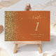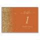 Det moderna bordsnumret bröllop i elegantens lämnat kant har en guld faux-utformning från glitter. Anpassadet kombinerar handskrift, rityta och kursivt typsnitt i blek guld-färgad med en brinnande orange.