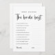 Förhöj din bröllopsfest med vårt anpassningsbara "Vem vet bruden bäst"-spelkort. Med en snygg svart-vit design lägger detta minimalistiska spel en rolig touch till din firande. Gästerna kan testa sin kunskap om bruden med personliga trivialitetsfrågor, vilket gör det till det perfekta tillskottet till din sista fest före ringfestligheterna.