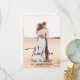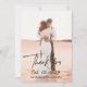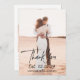Tack vare det moderna bröllop-kortet har du en enkel och minimal layout med "Tack" i en elegant skripttypografi. Här nedan står ditt datum i ett fet handskrivet teckensnitt tillsammans med namn över lodräts favoritfoto. Baksidan har ett andra lodrät bild tillsammans med personligen. Paletten färg är svart och vit och kan ändras i designredigeringen av verktyg.