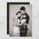 Modernt första julkort som nygifta med favoritfotot på framsidan med gift och glad i modern vit typografi.