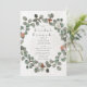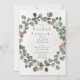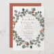 Inbjudan till denna bröllopsbrunch har en enkel, mjuk akvarellgrön och rostfärgad eukalyptuskrans på en vintage, slitna krämfärgad bakgrund. Baksidan är i en enkel rost terrakottafärg. Skapad av Simply Farmhouse Press.