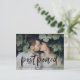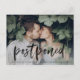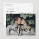 Behöver du ändra datum för din bröllopsdag? Våra eleganta postkort för ändring av bröllopsdatum är perfekta för att informera dina gäster om det nya datumet. Det trendiga ändra datum-postkortet har "uppskjutet" i en svart, handskriven borstscript med ert horisontella förlovningsfoto. Personalisera postkortet genom att lägga till era namn, returadress, bröllopsdetaljer, bröllopswebbplats, etc.