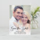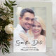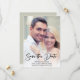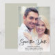 Modern, handskriven bröllopsinbjudan 'Save the Date' fotokort personifierad med namnen på den blivande bruden och brudgummen, bröllopsdatum och plats.