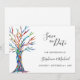 Detta unika bröllopskort för att spara datumet är dekorerat med ett färgglatt mosaikträd.