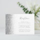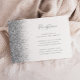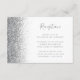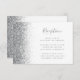 Den lämnat kant i eleganten har ett modernt mottagningskort för bröllopsdagar som har en silver faux glitter-utformning. Med anpassadet kombineras handskrift av blek silver grått, tryckplåt och kursivt typsnitt mot en vit bakgrund. Den omvända sidan har en matchande vit- och silver-glitter-design.