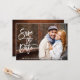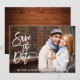 Modern Brush Script Spara Datum Förlovningskort med Foto - Vit Skrift, Rustik Trär rygg