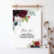 Denna moderna burgunderfärgade marinblå rosentonia datum skylt är perfekt för ett enkelt bröllop. Designen har röda, burgunderfärgade, marinblå, lila, blå och rosentonia vackert handmålade blommor och gröna blad. Datumidé-kort säljs separat.