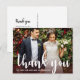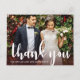Enkel vit "tack"-skrift med söta bröllops tack-meddelande på baksidan av kortet, och hel foto-front med trendig genomskinlig burgunder överdrag.