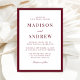 Celebrate your wedding day with this modern burgundy border wedding invitation, featuring a rich burgundy frame that adds warmth and timeless elegance to a clean, minimalist layout. The deep burgundy border creates a refined contrast against the white background, while classic serif typography and a subtle script accent lend a polished, sophisticated feel. Well-suited for formal ceremonies, traditional venues, and modern classic celebrations, this invitation offers a versatile foundation that feels both elegant and enduring. Personalize the wording to create a cohesive invitation that sets a confident and elevated tone for your wedding stationery suite.