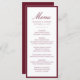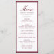 This wedding menu features “Menu” in rich burgundy calligraphy, paired with classic serif typography for the couple’s names, wedding date, and reception courses. The deep burgundy border frames the design with warmth and sophistication, making it an elegant choice for formal, romantic, and evening celebrations. With its refined layout and timeless color palette, this menu card presents your dining selections in a polished, cohesive style that complements a classic wedding table setting.