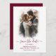 Elegant personlig-fotot, burgundy bröllop, sparar datumkorten med ett modernt skriptteckensnitt för att komplettera din romantiska burgundära bröllopsfest. Anpassa enkelt onlinen. Ladda helt enkelt upp foto och skriv in din favoritfilm i bröllop med vår moderna förlovning och skapa vackra kort för att informera din familj och dina vänner om ditt nya äventyr.
