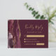 Det moderna djurutrymmeskortet i elegantens lämnat kant har en burgudisk vattenfärgad agate i gräns som trimmas med faux guld glitter. Rubriken "Kinly Reply" visas i handskriftsskript, med anpassade nedanför i guld färgad-typsnitt på en burgundröd bakgrund. Den bakomliggande sidan har en matchande burgundi och guld-agate-design.