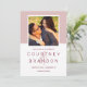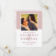 Modern bröllop spara datum-annonskort har ett foto med kvadratiska förlovningar inramat i ro rosa med ett enkelt och minimalistiskt stil-monogram av bruden och groom namn med ett elegant-skriptamperand. Anpassa datumtexten med datum och plats i bröllop. På baksidan av kortet finns en smal mönster av tunt burgundöst rött och vitt vågrät rand.
