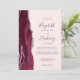 The left-hand edge of this elegant modern wedding invitation features a burgundy watercolor agate border trimmed with silver faux glitter. The customizable text combines charcoal gray handwriting script with copperplate and italic fonts on a blush pink background. The reverse side provides space for wedding details on a solid blush background, along with a QR code guests can scan to visit your website and RSVP, which saves the cost of printing and mailing separate RSVP cards.