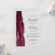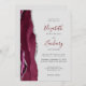 The left-hand edge of this elegant modern wedding invitation features a burgundy watercolor agate border trimmed with silver faux glitter. The customizable text combines burgundy handwriting script with charcoal gray copperplate and italic fonts on a pale gray background. The reverse side provides space for wedding details on a solid pale gray background, along with a QR code guests can scan to visit your website and RSVP, which saves the cost of printing and mailing separate RSVP cards.