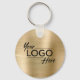 Främja en modern nyckelkedja för ditt företag med logotypen mot en borstad guld-fin metallisk bakgrund.