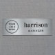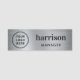 Professionell namn bricka med ditt företags eller din organisations logotyp på en silver faux metallisk bakgrund, ditt namn i fet modern typografi och titel i enkel typografi.