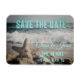 Modern, icke-traditionell Spara datum magneter har nedsänkt strandscen (som inkluderar vinkar och stjärnfisk i sanden) med fotografibakgrund med Spara datum i akvblått neon. Anpassa med bröllop-parets detaljer.