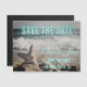 Modern, icke-traditionell Spara datum meddelande har nedsänkt strandscen (som inkluderar vinkar och stjärnfisk i sanden) med fotografibakgrund med Spara datum i akvblått neon. Anpassa med bröllop-parets detaljer.