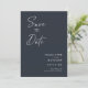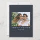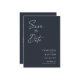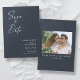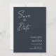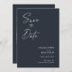 Modern, minimalistisk och elegant "Save the Date"-fotokort i bröllop-förlovningen. I anpassad design finns inslag av modern text med ett unikt kalligrafiskt bläck-skript. Bilden i par markerar baksidan av kortet. Färger skriver vitt på skifferblått eller anpassar enkelt färg vid behov.