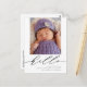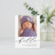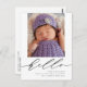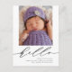 Det här vykortet för födelseanmälan i eleganten har en modern kalligrafi som visar "hej" och ett stort foto. Under skriptbokstäverna kan du lägga till din baby fullt namn, födelsedatum, födelsestatus och din namn. På baksidan av vykortet kan du skriva ett anpassningsbar-meddelande till nära och kära.