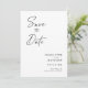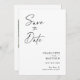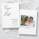 Modern, minimalistisk och elegant "Save the Date"-fotokort i bröllop-förlovningen. I anpassad design finns inslag av modern text med ett unikt kalligrafiskt bläck-skript. Bilden i par markerar baksidan av kortet. Färger skriver svart på vitt eller anpassar enkelt färg vid behov.