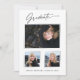 Tre fotografier, trendig, moderna och elegant studenten-meddelandekort, med inslag av modern text med calligraphy bläck-skript. Student-bilderna på kortets framsida markeras med en delikat och minimalistisk övertoningsmarkör. Kortets baksida ger personlig textutrymmen för information om studenten eller kan raderas om du vill skicka ett meddelande till skrivan. Svartvit eller anpassa bakgrunden så att den passar din skolas primära färg eller valfritt färg. Perfekt för högskola, högskola och universiteten grad studenter.