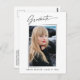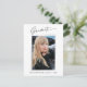 Trendig, moderna och elegant studenten-vykort för fotoannonsering, med inslag av modern text med calligraphy bläck-skript. Student bild på kortets framsida accentueras med en delikat och minimalistisk övertoningsmarkör. Kortets baksida ger personlig textutrymmen för information om studenten eller kan raderas om du vill skicka ett meddelande till skrivan. Svartvit eller anpassa bakgrunden så att den passar din skolas primära färg eller valfritt färg. Perfekt för högskolan, högskolan och universiteten grad student.