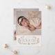 Modern födelseprospekt med fyra fotomaterial tillsammans med modern kalligrafi och blommigt inslag på baksidan. Den här moderna designen får dina foton från baby att skina!