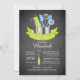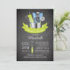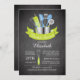 Modern lagrar i köket inbjudningskort för möhippan med en blandningskål fylld med grönt & blått kök verktyg accentuerad med en modern grönt banderoll och satt på contemporaryns svarta krita. Besök vår butik för att se vår snyggt utensil möhippa inbjudan i en mängd populära bröllop färg.