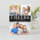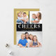 Detta platta nyårskort har tre bilder på framsidan med orden "CHEERS to the new year". Bakgrunden är svart och kan ändras till en annan mörk färg genom att välja anpassa. Baksidan har anpassad text så att du kan lägga till ditt eget personliga meddelande eller det generiska meddelandet.