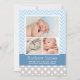 De moderna födelseattecknen i baby innehåller tre foton av ditt söta pojke som är inramade av snyggt Chevron rand och polka dot mönster. Vit, himlar blå, tårblått och mjuk pewter grått färg.